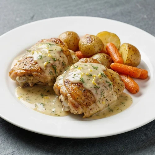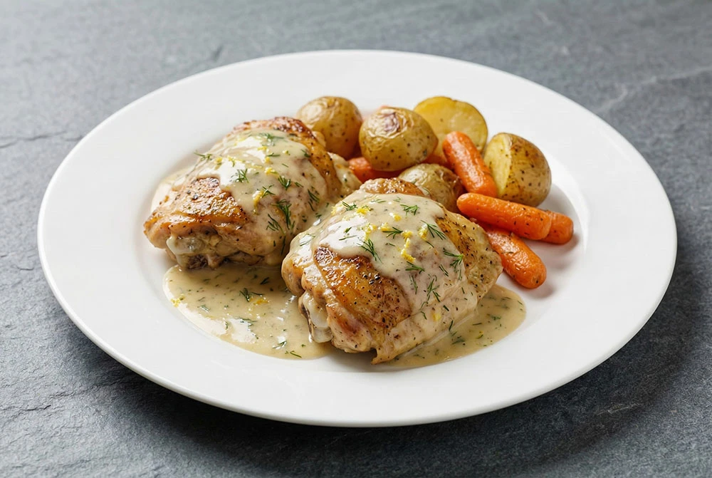 To serve this exquisite dish with the elegance it deserves, focus on clean lines and textural contrast. Gently nestle the tender chicken thighs into a bed of your chosen accompaniment – perhaps perfectly cooked pasta or fluffy rice. Spoon a generous amount of the velvety lemon dill sauce over the chicken, ensuring it cascades invitingly. For a final touch of refinement, lightly wipe the rim of the plate with a clean linen napkin to remove any stray sauce drips. Garnish artfully with a few fresh dill sprigs, their vibrant green color providing a beautiful visual counterpoint to the creamy sauce. The goal is a presentation that is both inviting and impeccably neat, signaling the care taken in its preparation.